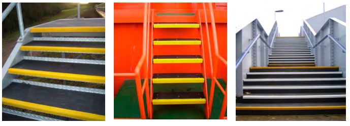 Peldaño de 4 mm de grosor, negro con superficie cerrada y borde amarillo frontal de seguridad de 40 mm.